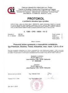 Protokol o zkoušce typu výrobku – brána posuvná manuální